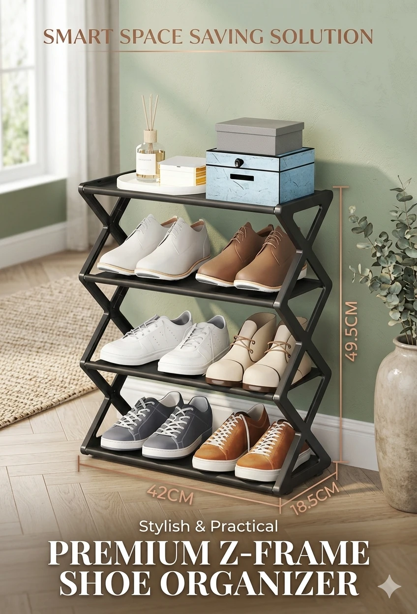 Upgrade your home organization with the Premium Z-Frame 4 Layer Shoe Organizer, designed to combine modern style with practical storage. Its unique Z-shaped frame adds a contemporary touch while providing strong and stable support for your footwear collection.